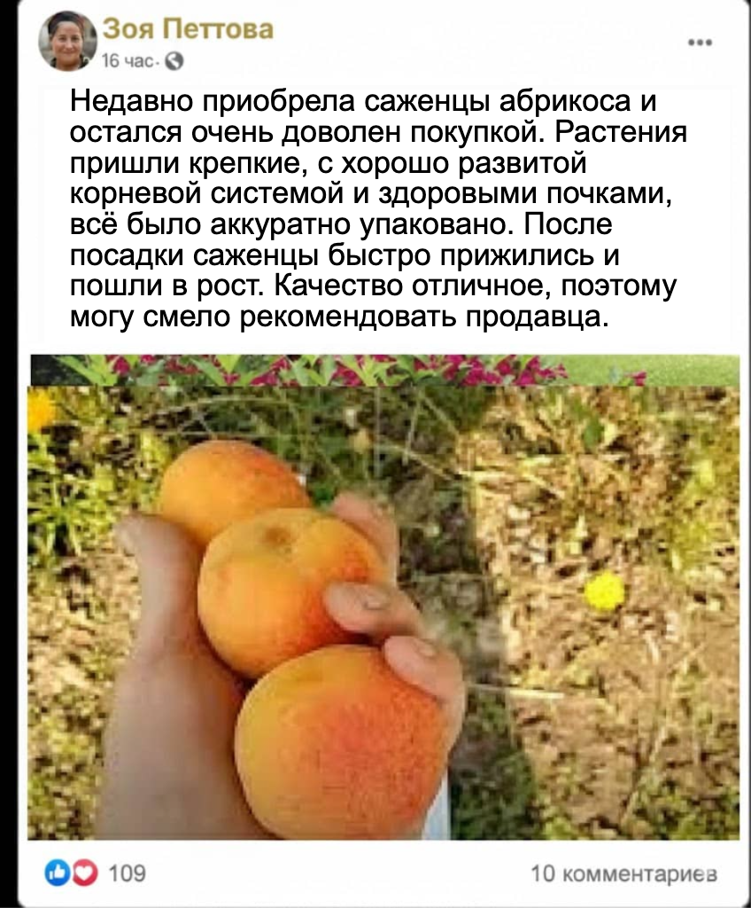 Мы создали самый вкусный и неприхотливый сорт абрикоса. Вы получите полностью готовые к посадке саженцы. Все саженцы из нашего семейного питомника.